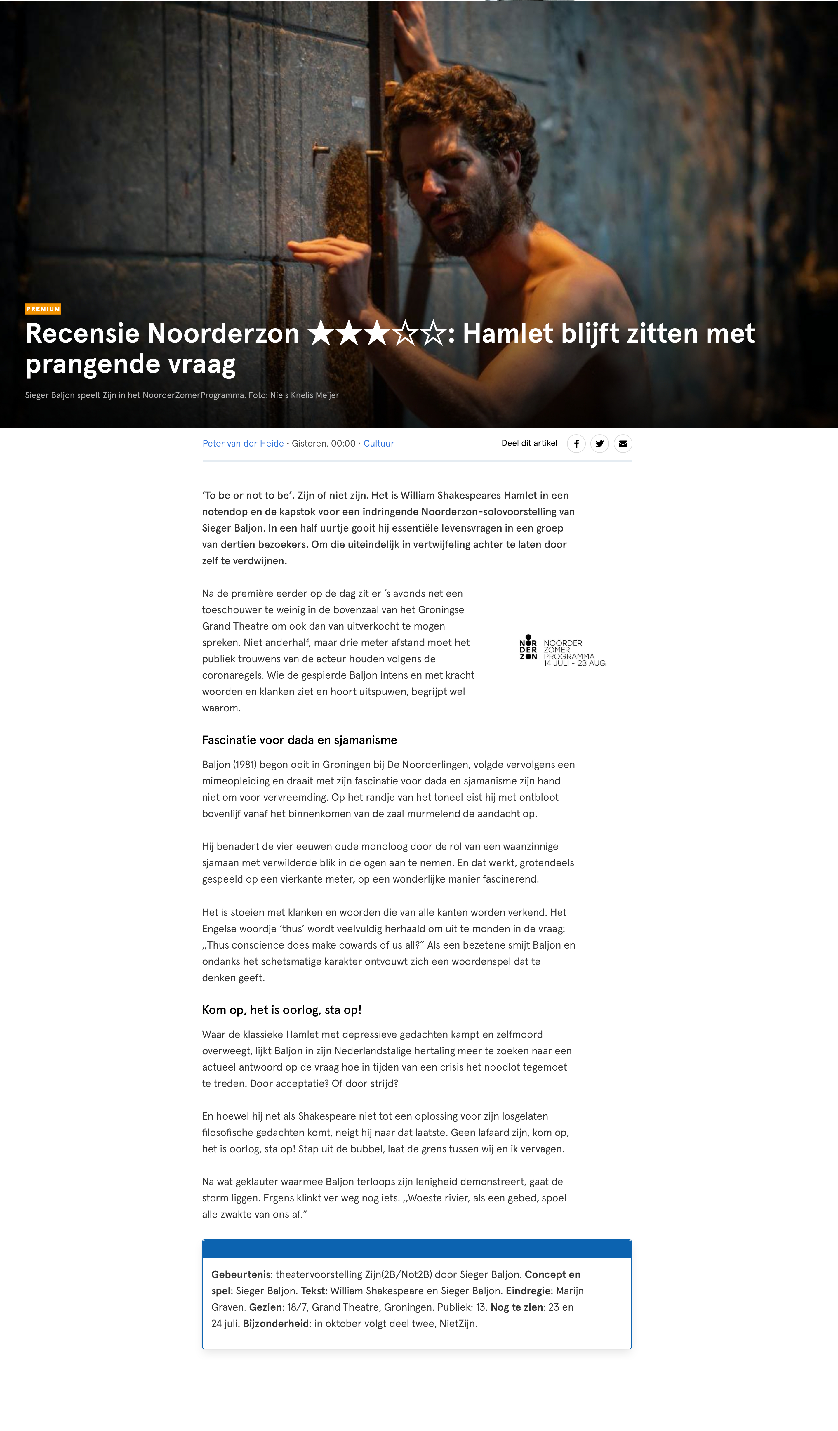 "Wat gebeurt er met Hamlets even radeloze als woedende ‘to be or not to be’-monoloog als je hem losrukt uit de context van het stuk en hem tot een autonome tekst maakt? Als er geen door zijn oom vermoorde vader meer is en geen hertrouwde moeder. Wat hou je dan over? (…) In zijn solo laat hij dadaïstische principes los op Shakespeare en het resultaat is verbluffend. (…) Het is alsof de woorden hem van gene zijde worden ingefluisterd en via zijn stem tot ons komen. Hij proeft ze, lijkt zelf af en toe verbaasd over de klanken die hij voortbrengt. (…) In dat vervolg onderzoekt Baljon de betekenis van Hamlets monoloog voor het heden, in een rijke poëtische tekst vol prachtige, mysterieuze zinnen. ‘Slaap als punt achter het drama/dit opengescheurd sidderend hart/die duizend zeer natuurlijke aardbevingen in onze bedrading/als erfenis door ons vlees geweven.’ Hier klinkt de echo van Shakespeare maar ook onmiskenbaar de stem van Baljon zelf."