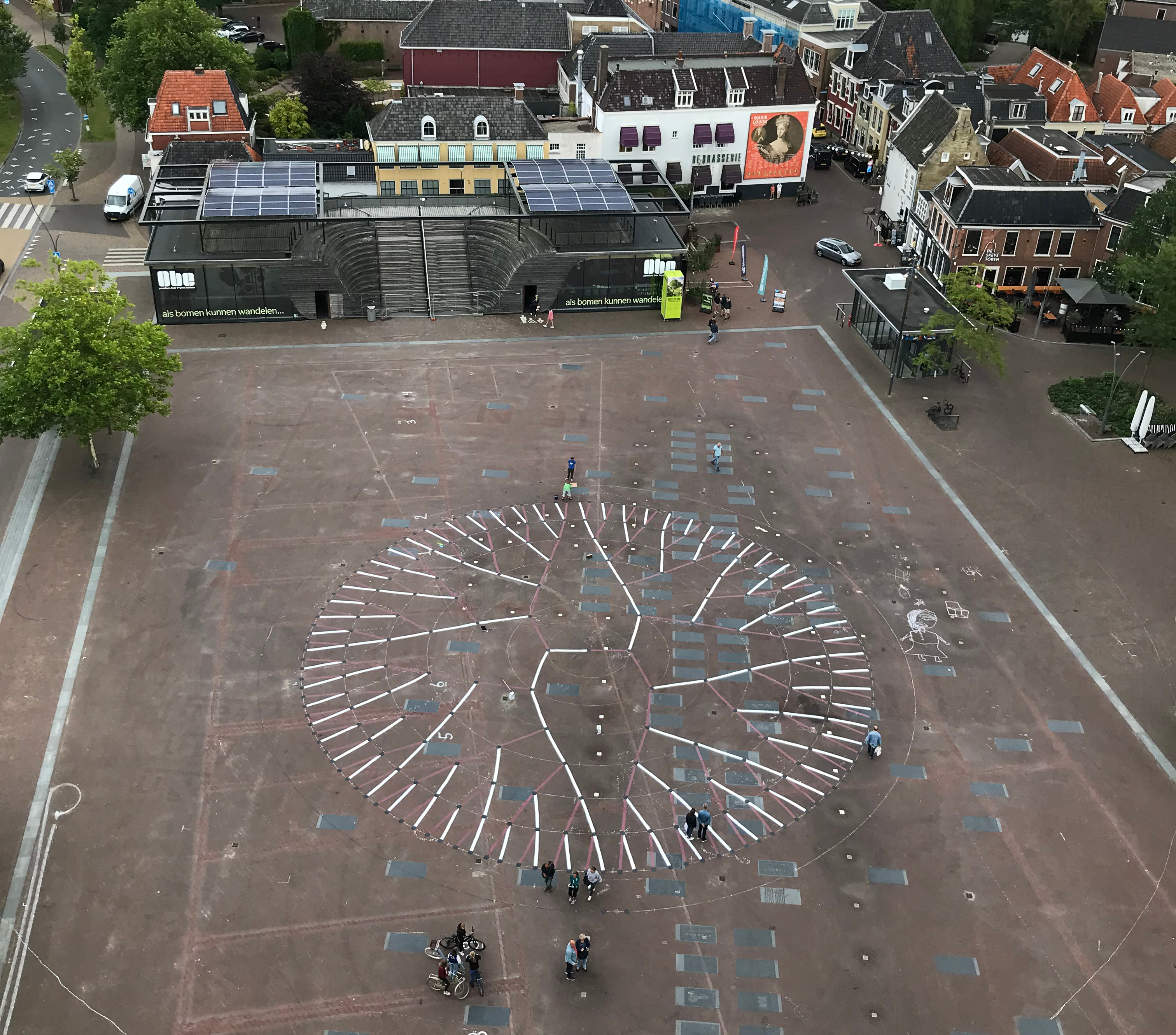 Wij dragen sporen. Het is zomer. Op een plein, schuin over het grondplan van een verdwenen kathedraal, verschijnt een cirkel. Een absurdistisch verkeersplan? Een gymzaal zonder muren? Een sacrale corona-wachtrij? Een openbaar altaar?