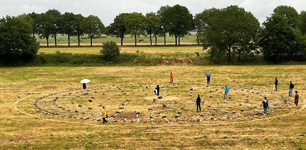 Op een zandafgraving tussen de Hondsrug en het veen, waar op steenworp afstand de spiegels van de LOFAR ruimtetelescoop de kosmos in turen op zoek naar de oerknal; op dat veld waar een laag tijd uit die Hondsrug gegraven is voor een spoordijk, ligt een cirkel. Een megalithisch monument? Een graancirkel? Een groot bordspel?